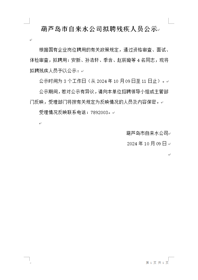 葫蘆島市自來(lái)水公司擬聘殘疾人員公示