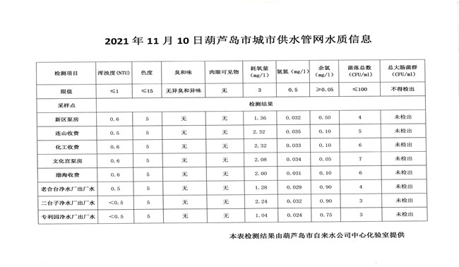 2021年11月10日葫蘆島市城市供水管網(wǎng)水質(zhì)信息