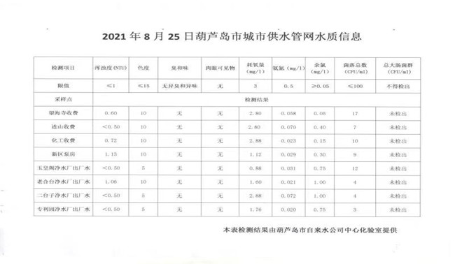 2021年8月25日葫蘆島市城市供水管網水質信息