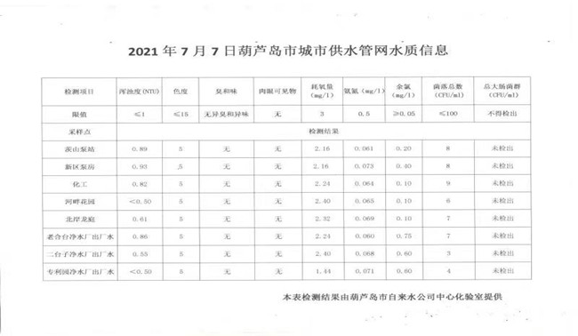 2021年7月7日葫蘆島市城市供水管網(wǎng)水質(zhì)信息