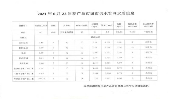 2021年6月23日葫蘆島市城市供水管網水質信息