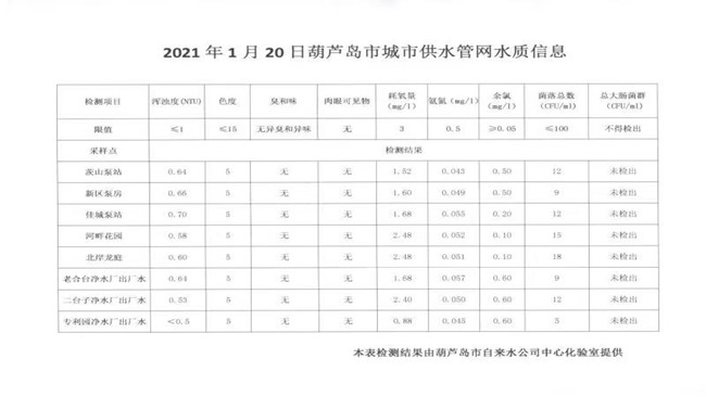 2021年1月20日葫蘆島市城市供水管網(wǎng)水質(zhì)信息