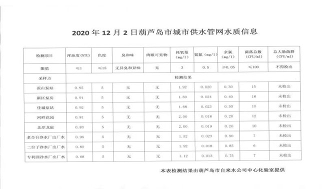 2020年12月2日葫蘆島市城市供水管網(wǎng)水質(zhì)信息