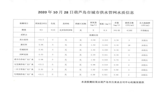 2020年10月28日葫蘆島市城市供水管網(wǎng)水質(zhì)信息