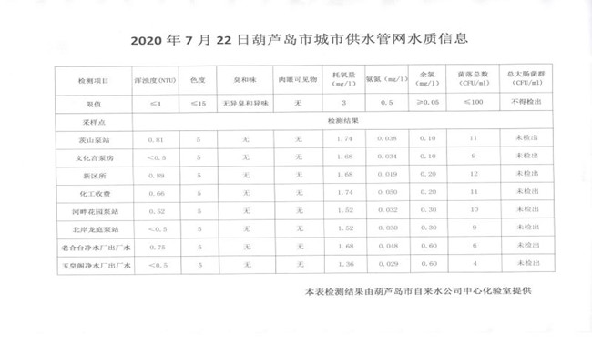 2020年7月22日葫蘆島市城市供水管網(wǎng)水質(zhì)信息