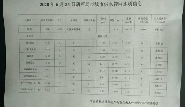 2020年6月24日葫蘆島市城市供水管網(wǎng)水質(zhì)信息