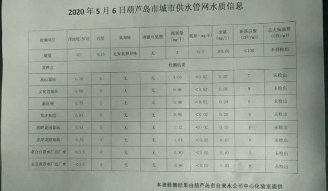 2020年5月6日葫蘆島市城市供水管網(wǎng)水質信息