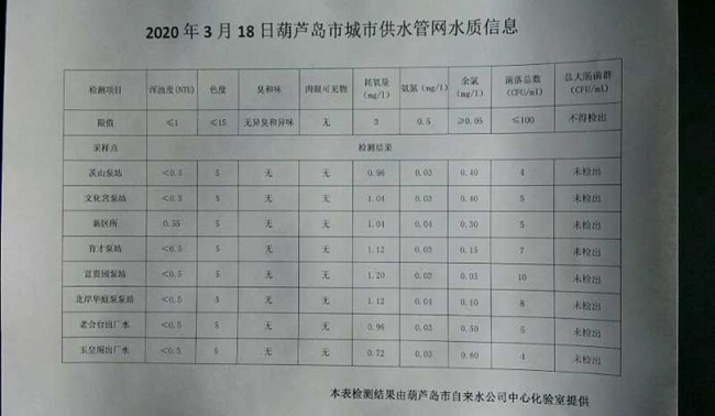 2020年3月18日葫蘆島市城市供水管網(wǎng)水質(zhì)信息