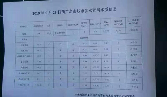 2019年9月25日葫蘆島市城市供水管網(wǎng)水質(zhì)信息
