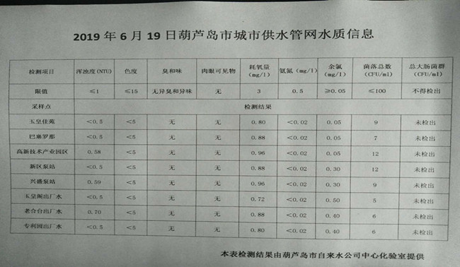 2019年6月19日葫蘆島市城市供水管網(wǎng)水質(zhì)信息