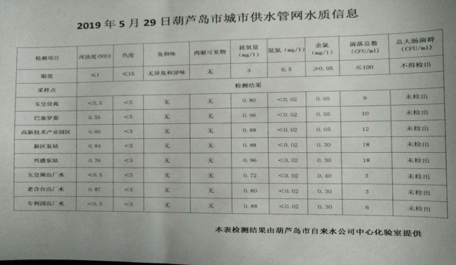 2019年5月29日葫蘆島市城市供水管網(wǎng)水質信息
