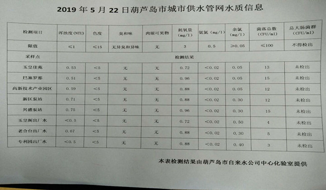 2019年5月22日葫蘆島市城市供水管網(wǎng)水質(zhì)信息