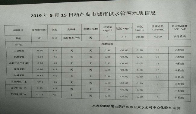 2019年5月15日葫蘆島市城市供水管網(wǎng)水質(zhì)信息