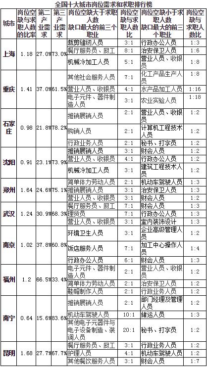 同時(shí)發(fā)布的“全國十大城市崗位需求和求職排行榜”顯示,監(jiān)控的10個(gè)城市里,有9個(gè)城市第三產(chǎn)業(yè)的用人需求最大,其中有城市急需機(jī)動(dòng)車駕駛?cè)藛T,崗位需求與求職人數(shù)比達(dá)到10:1。崗位需求數(shù)與求職人數(shù)同比均降近一成