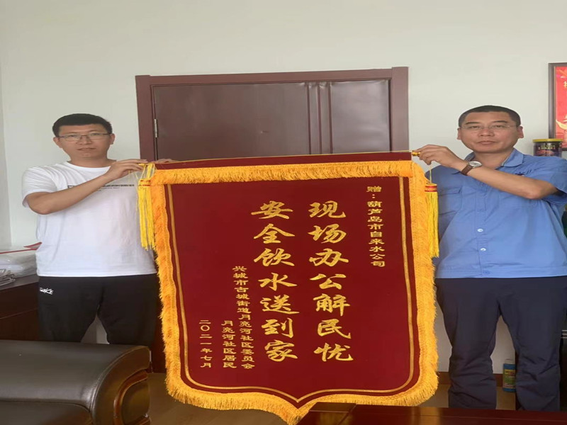 7月28日,興城市古城街道月亮河社區(qū)委員會(huì)和社區(qū)居民代表來到葫蘆島市自來水公司,送來一面“現(xiàn)場(chǎng)辦公解民憂?安全飲水送到家”的錦旗,衷心感謝自來水公司領(lǐng)導(dǎo),上門服務(wù)現(xiàn)場(chǎng)辦公,積極協(xié)調(diào)解決了小區(qū)水壓?jiǎn)栴},改善了小區(qū)居民的居住質(zhì)量。