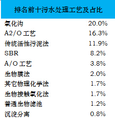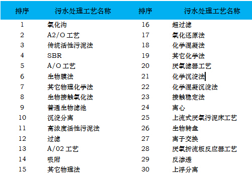據(jù)不完全統(tǒng)計(jì),全國(guó)范圍內(nèi)已建成運(yùn)營(yíng)的污水處理廠數(shù)量約4000座,這其中有統(tǒng)計(jì)數(shù)據(jù)的污水處理工藝大約30種左右,E20研究院統(tǒng)計(jì)各類技術(shù)工藝,排名如下文所示: