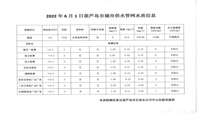 2022年6月1日葫蘆島市城市供水管網(wǎng)水質(zhì)信息