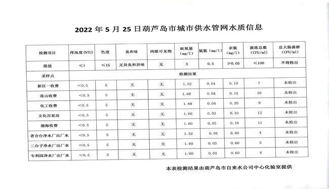 2022年5月25日葫蘆島市城市供水管網(wǎng)水質(zhì)信息