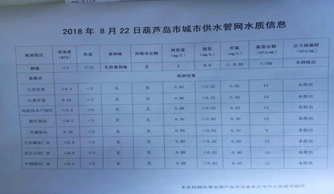 2018年8月22日葫蘆島市城市供水管網(wǎng)水質(zhì)信息