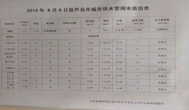 2018年6月6日葫蘆島市城市供水管網(wǎng)水質(zhì)信息