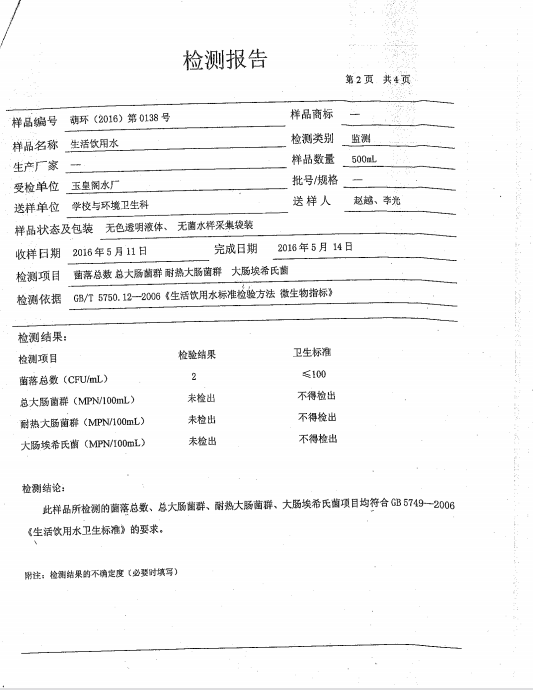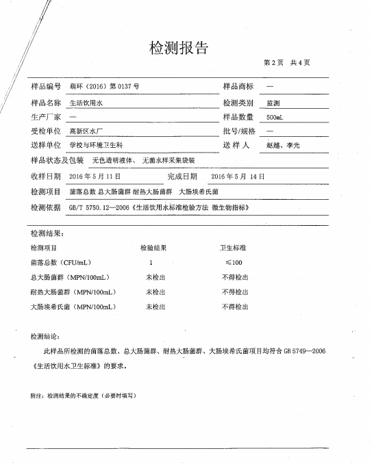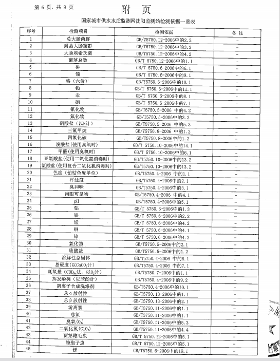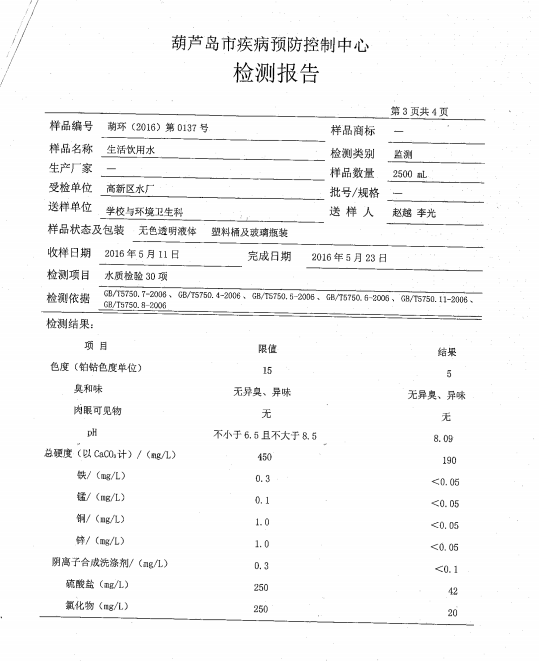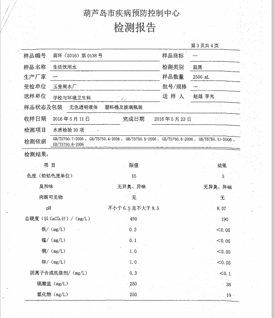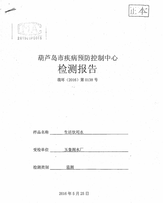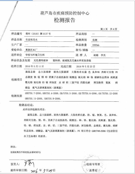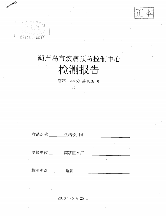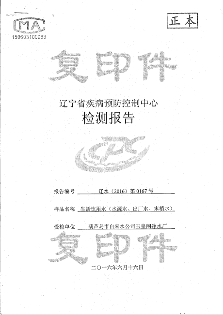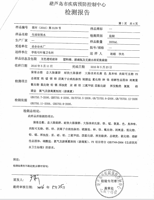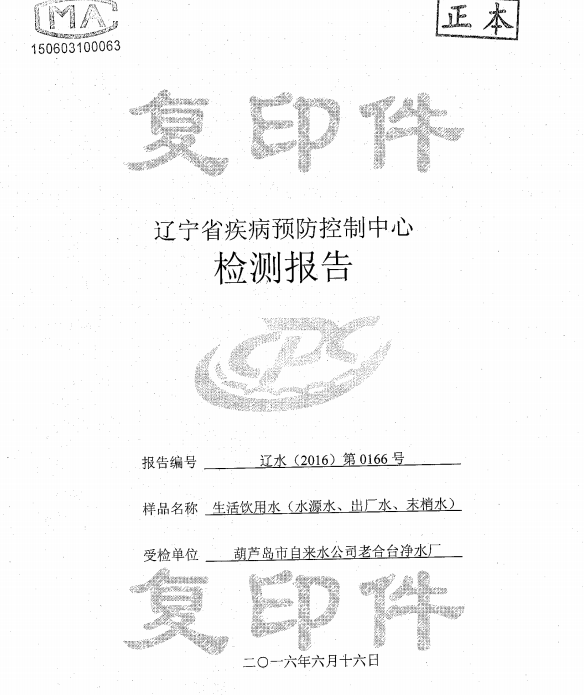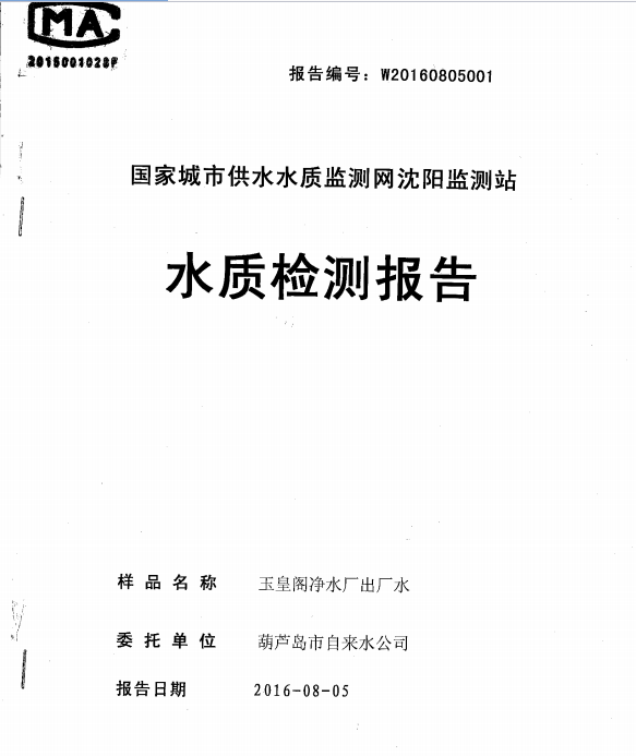 葫蘆島市自來水公司2016年水質(zhì)檢測(cè)報(bào)告公示